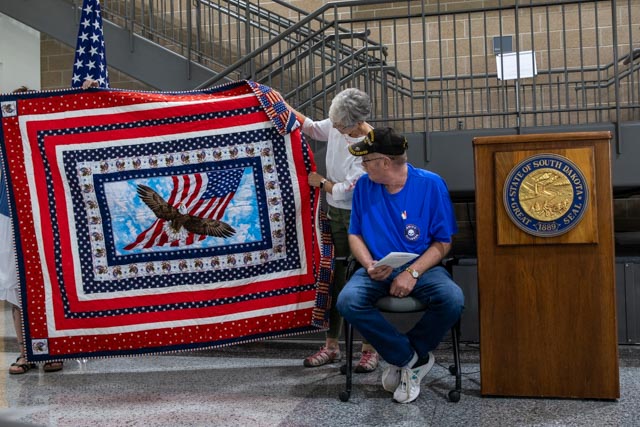 CAMP RAPID, S.D. (MITCHELLNOW) Army Staff Sgt. (RET) Andy Davis of Rapid City was honored with a Quilt of Valor for his over 29 years of South Dakota National Guard service at Joint Force Headquarters on Camp Rapid, on August 5.