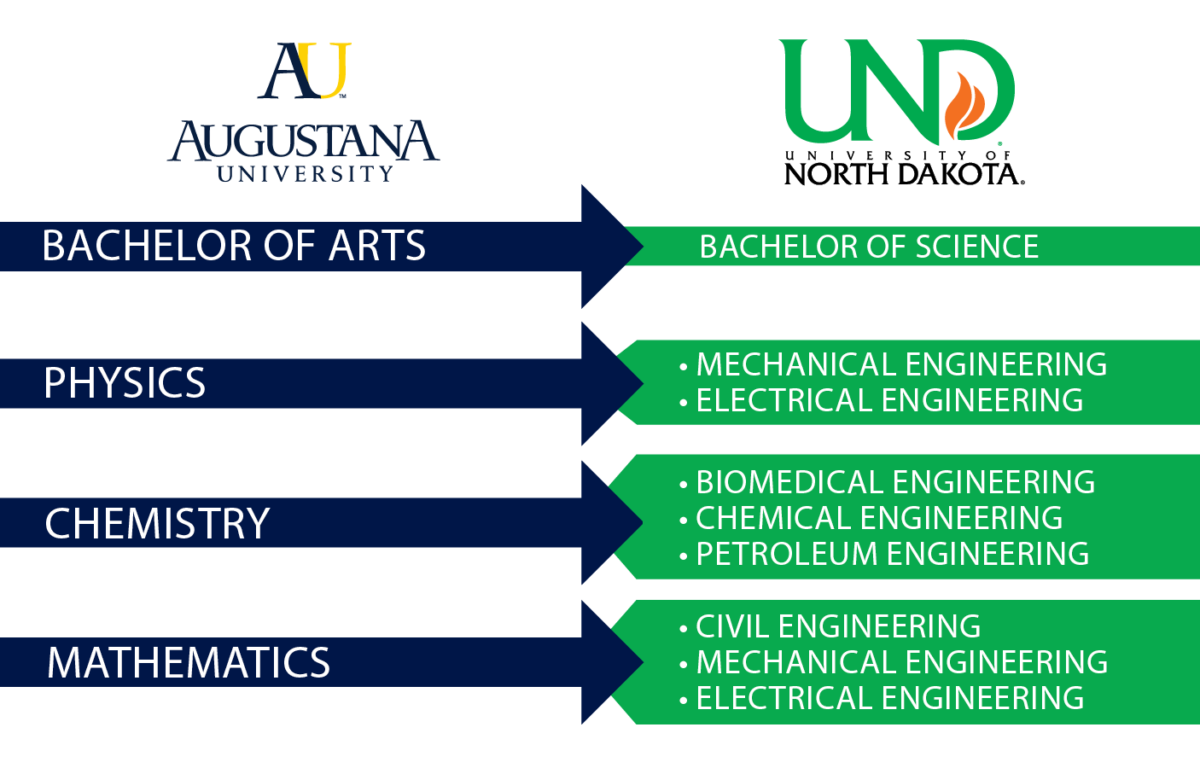 As part of the new program, engineering students will take foundational courses at Augustana, earning a Bachelor of Arts (B.A.) degree in chemistry, physics or mathematics at the university. Students will begin taking online engineering courses in their second year — offered through the University of North Dakota (UND). Taking the online classes together, students will have the opportunity to form strong bonds and collaborate on real-world engineering challenges.