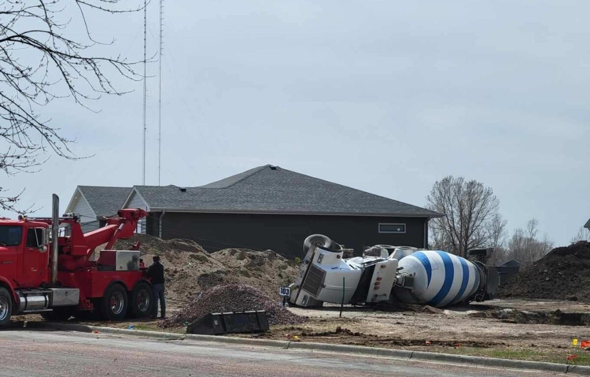 On Tuesday morning, a cement truck fell into a hole near Wild Oak Golf Course.  The female driver was not seriously injured in the incident, which happened at the corner of Quiett Lane and Doris Court in the construction area of a Mitchell Technical College site house.  She was briefly stuck inside the truck until others at the site managed to get her out.  Mitchell Technical College students were in the hole when the ground gave way.  Nobody was injured.  The pictures below show wreckers attempting to move the truck, which was carrying rock, from the scene.