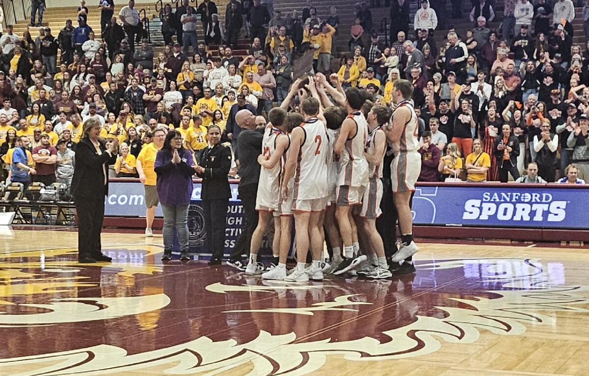 Aberdeen, SD (MITCHELLNOW) The Howard Tigers were looking for their first State Boys Basketball Championship since 1964 when they tangled with the three-time defending State Champs in the DeSmet Bulldogs Saturday night in Aberdeen. The game was a back-and-forth battle and with 1.2 seconds remaining Luke Koepsell hit a shot underneath to give Howard a 52-50 lead only to see the Bulldogs toss a full-length pass and hit the game tying shot as the horn sounded and sent the game into overtime. Howard would not hit a field goal in overtime, instead they made a couple of stops, collected a huge offensive rebound and hit 8 of 10 from the free throw line in overtime and the Howard Tigers beat DeSmet 60-55 to win the State Class B Championship.