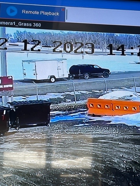 On Sunday, at approximately 2:30 PM, a 6 x 12 white enclosed trailer was stolen from a business parking lot in the 1400 block of West 8th in Mitchell. A black SUV is seen pulling the trailer away from the parking lot.  Pictures of the vehicle and trailer can be found below.