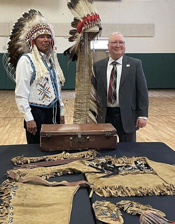 Major Newell directed his descendants never to throw these items away and never to sell them.  His ancestors obeyed him for five generations and then James Newell of Le Center, Washington wondered if there wasn’t a more appropriate place for these artifacts than in a suitcase passed from generation to generation of Newells.  So, James Newell began searching for the fifth-generation descendant of Chief Spotted Tail.  Newell found him in the form of John Spotted Tail, a resident of the Rosebud Reservation.  Newell gave the artifacts to the modern Spotted Tail in 2022.  John Spotted Tail recently donated those artifacts to the South Dakota Historical Society.