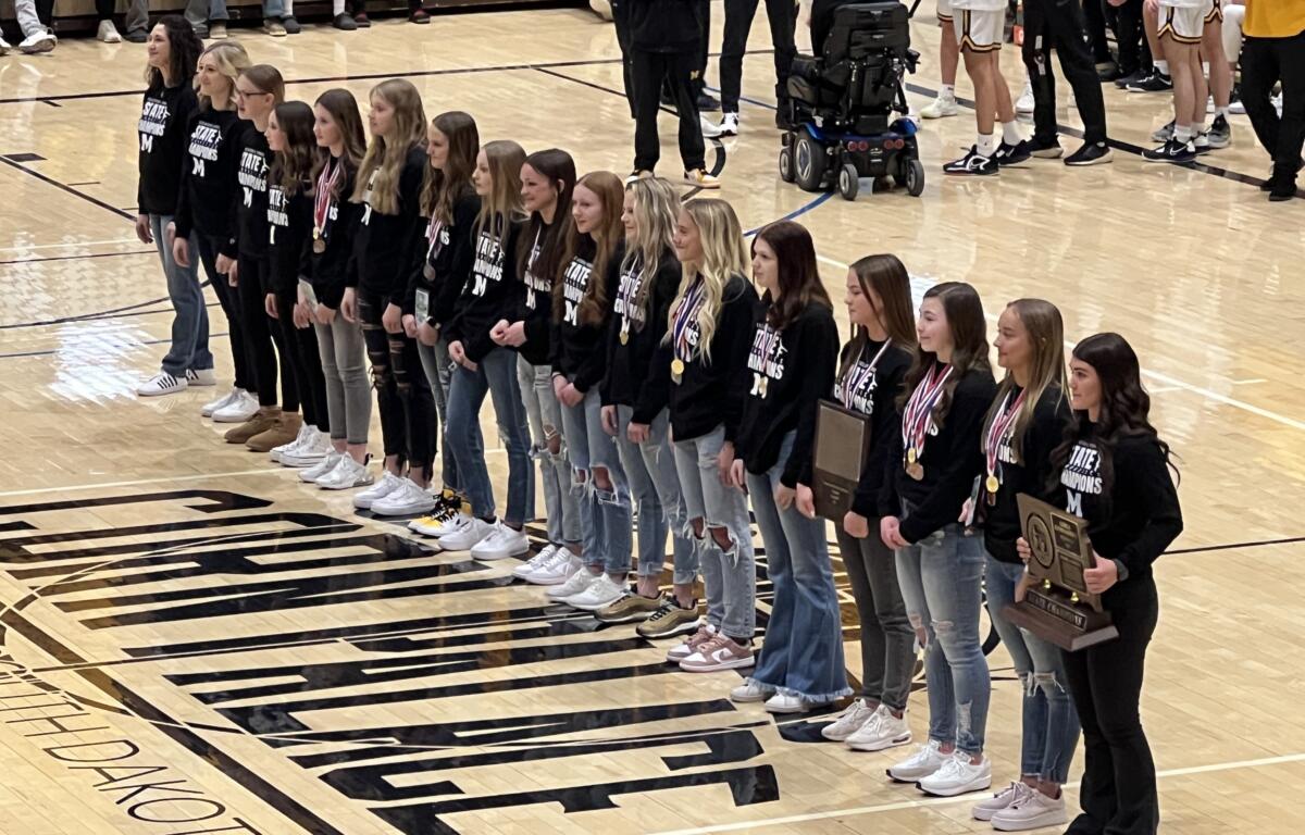 MITCHELL — During pregame of the Mitchell Kernels’ basketball game on Thursday, the AA state champion Kernels gymnastics team was honored. The Kernels won MHS’s eighth overall gymnastics team title in program history over the weekend.