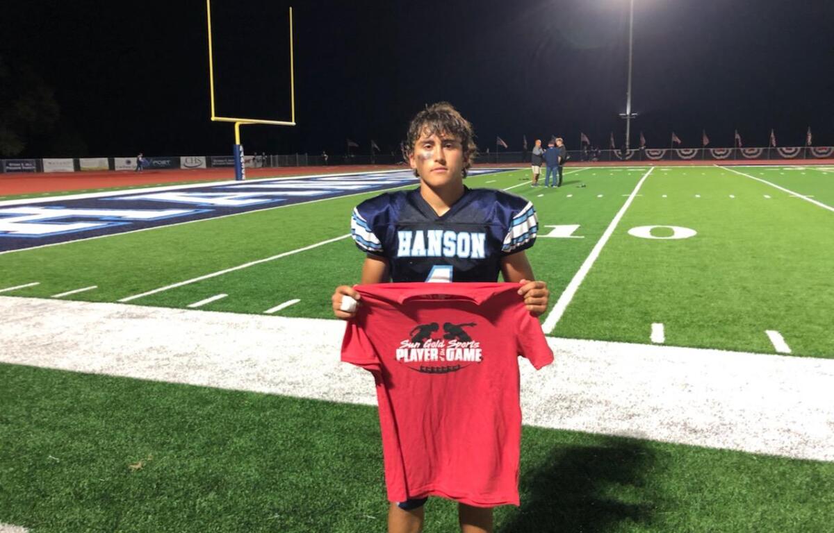 ALEXANDRIA, S.D. — Jackson Jarding, senior for the Hanson Beavers, was named Sun Gold Sports Player of the Game for the Sept. 10, 2022, contest of the Hanson Beavers vs Parkston Trojans. Jarding recovered a fumble and returned it 100 yards for a touchdown in Hanson’s 8-6 win. Listen to area football coverage every Friday night during the season on Kool 98.3 FM and Kool98.com.